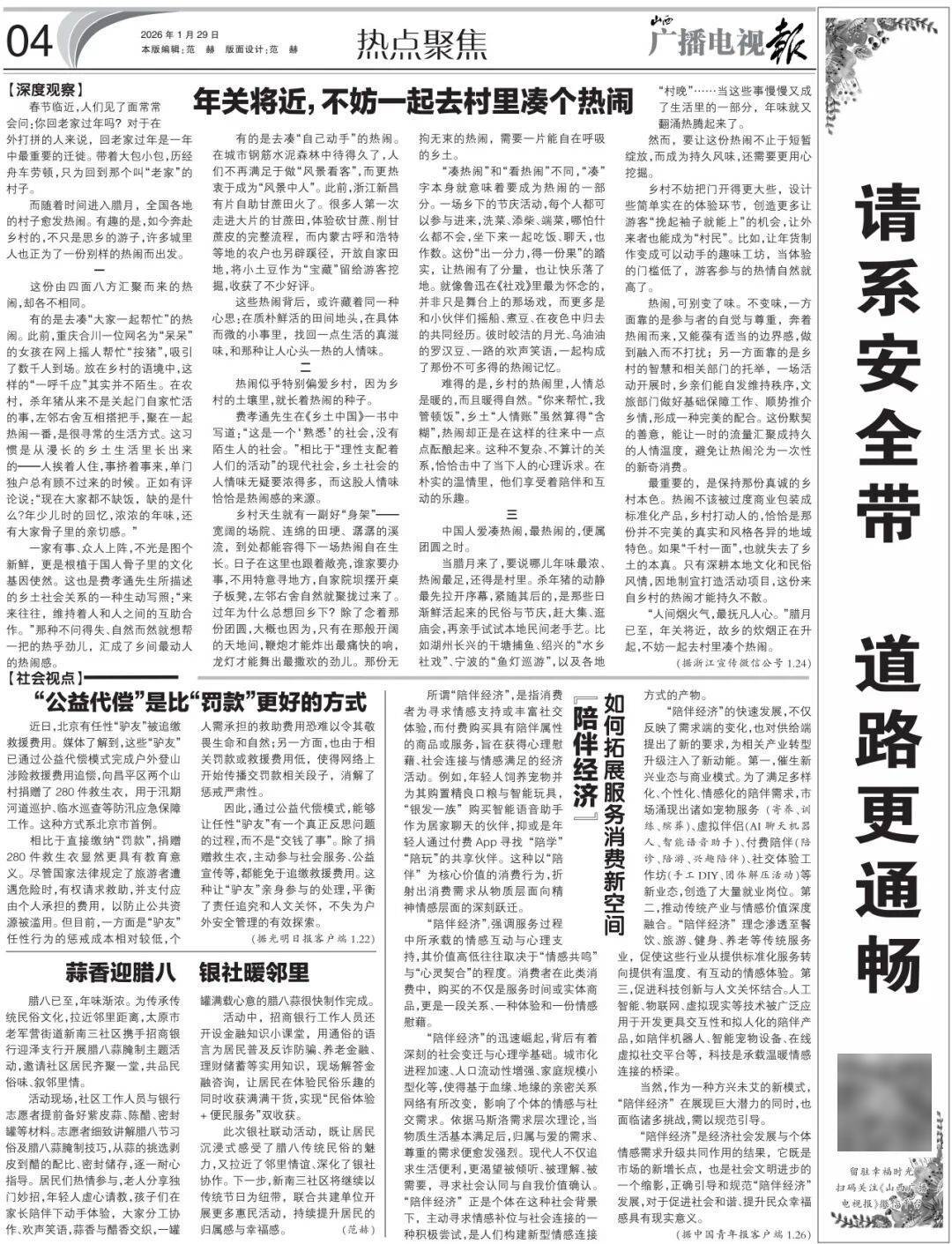 “陪伴经济”是经济社会发展与个体情感需求升级共同作用的结果,它既是市场的新增长点,也是社会文明进步的一个缩影,正确引导和规范■•▼“陪伴经济▲•▪”发展☆,对于促进社会和谐、提升民众幸福感具有现实意义。(据中国青年报客户端1.26)