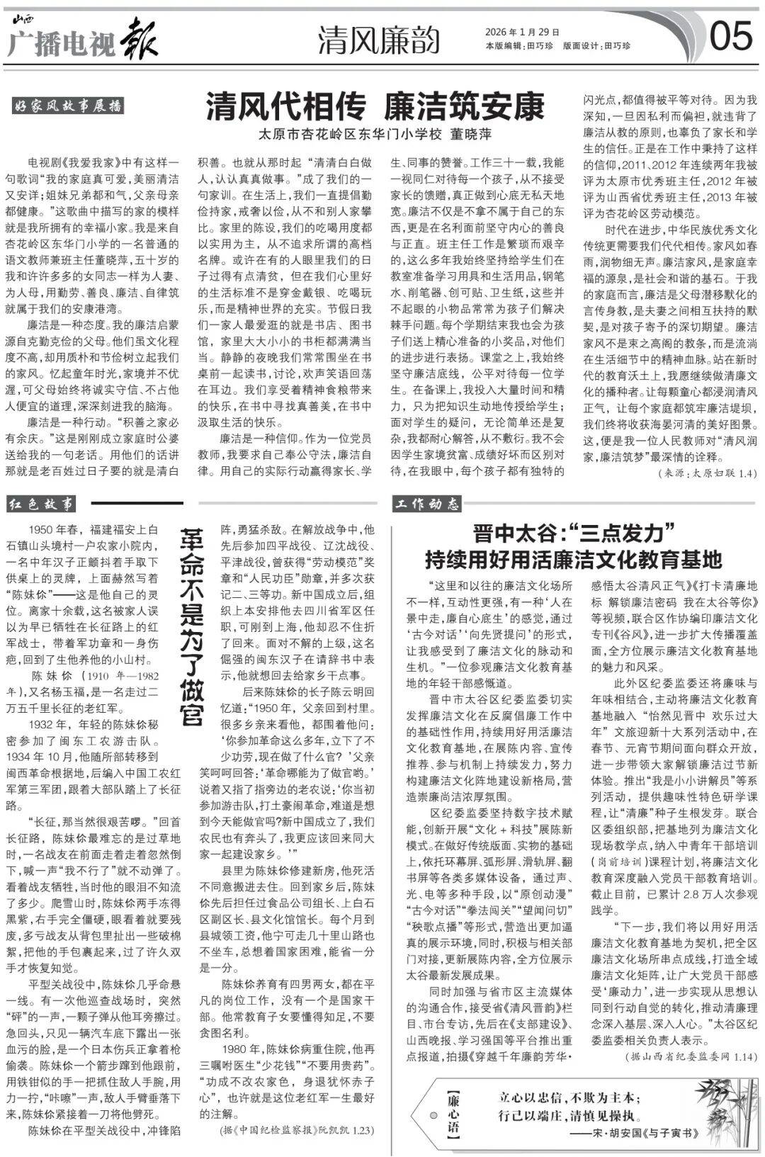 同时加强与省市区主流媒体的沟通合作,接受省《清风晋韵》栏目、市台专访,先后在《支部建设》△•=、山西晚报、学习强国等平台推出重点报道,拍摄《穿越千年廉韵芳华·感悟太谷清风正气》《打卡清廉地标 解锁廉洁密码 我在太谷等你》等视频•◁•,联合区作协编印廉洁文化专刊《谷风》,进一步扩大传播覆盖面,全方位展示廉洁文化教育基地的魅力和风采。